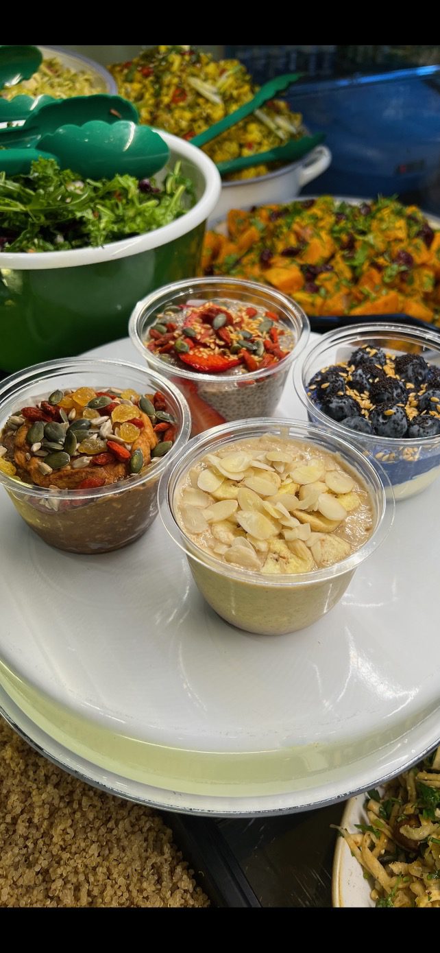 Yoghurt, blueberries, oats, agave, blue spirulina, oat milk, poppy and flax seeds